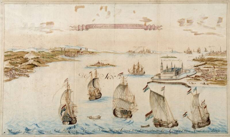 De Sont in 1726 gezien naar het zuiden. Rechts op de voorgrond Helsingør en kasteel Kronborg. Links de Zweedse kust. (Het Scheepvaartmuseum)