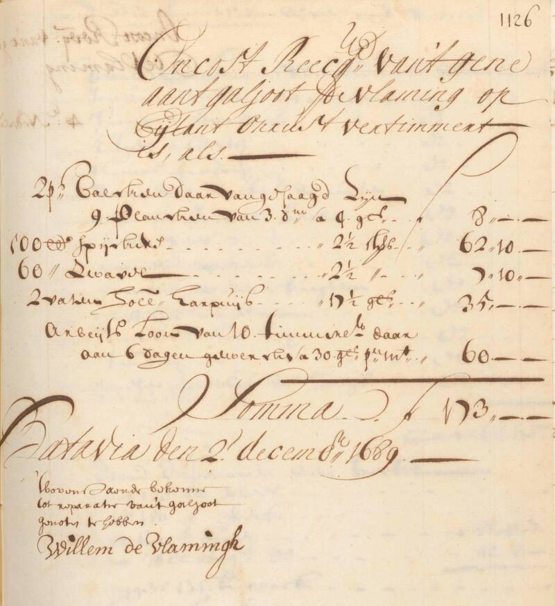 Verder is er daar op het eiland Java nog van alles ingeslagen voor de terugweg. Dat blijkt uit een andere rekening die nog altijd bewaard is gebleven van meer dan driehonderd jaar geleden! (7) Daaruit valt op te maken dat Willem de Vlamingh uijt de kleene winckel in Batavia verschillende dingen bestelde, zoals vlaggedoek, naijgaren, specerijen, peper, diverse aerdewerck in totaal voor ruim 67 gulden. Door den Equipaguemeester werden dingen gekocht als een copere ketel, 8 compas glasen, een planckenier en stutten.