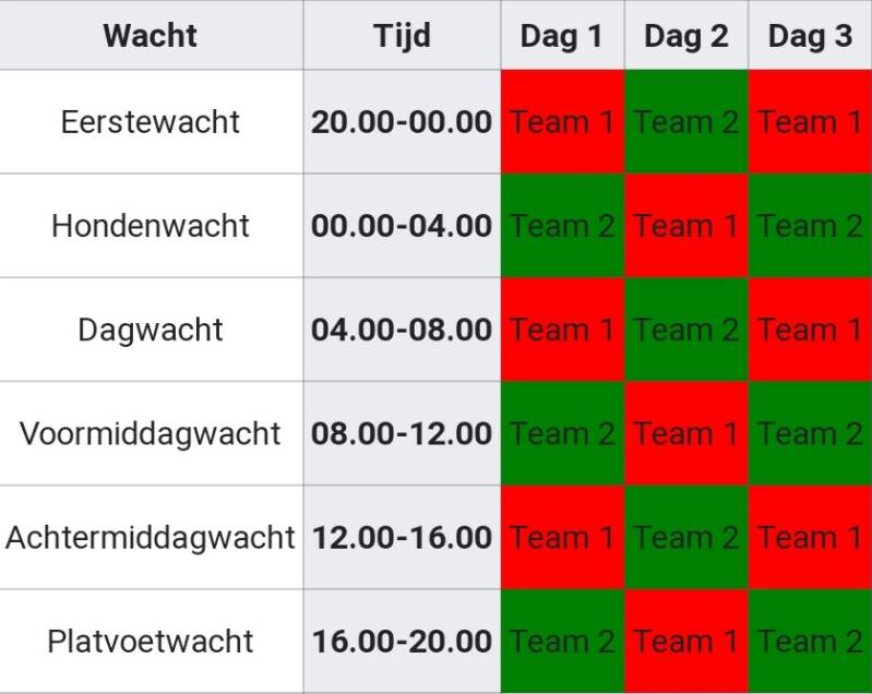 Eenmaal op Kaap de Goede Hoop moet gezorgd worden voor voldoende versche spijse en zal men ook het scheepsvolk behoorelijk laten ververschen en uijtrusten. Na zoveel maanden varen, was de bemanning meestal flink vermoeid. Zeelieden waren letterlijk dag en nacht in touw, want ook in de nacht werd doorgevaren (er is tenslotte midden op zee nergens een goede ankerplaats). In diensten van vier uur op en acht uur af leefde men met de klok: werken, eten, slapen. Ieder half uur ging er een bel die de tijd sloeg en iedere vier uur was er een wisseling van de wacht: de eerste wacht begon ‘s avonds om 20.00 uur en liep door tot middernacht enzovoort. Zie de afbeelding hiernaast met traditionele wachten aan boord van schepen: